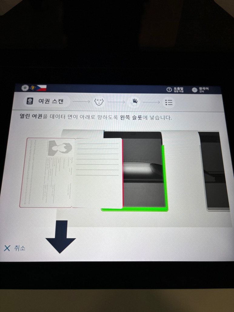 여권 정보 나오는 페이지가 아래로 가도록 기기의 왼쪽 슬롯에 여권을 넣습니다.