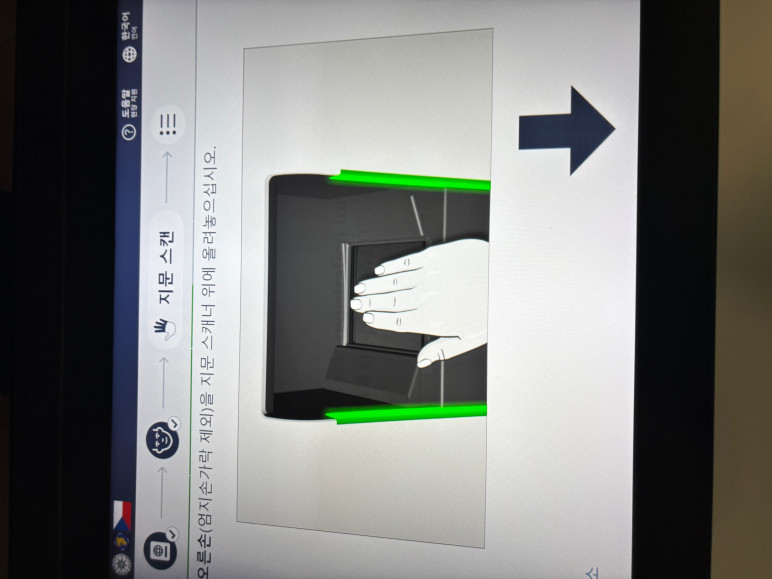 아래쪽 슬롯 (왼쪽 여권, 오른찍 지문)으로 등록하고