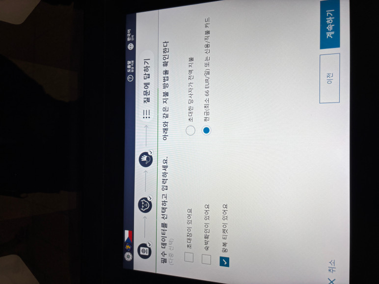 필수데이터에서 숙박확인, 왕복티켓 선택하시고, 여행 경비 지불방법은 현금으로 지정하신 후 계속하기 탭합니다.