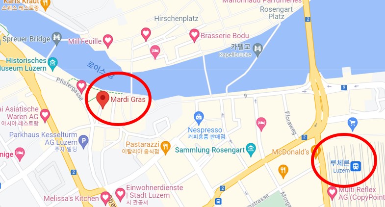 그리고 오른쪽 빨간색 동그라미는 루체른 기차역인데요, 기차역에서 카페는 상당히 가깝습니다:)